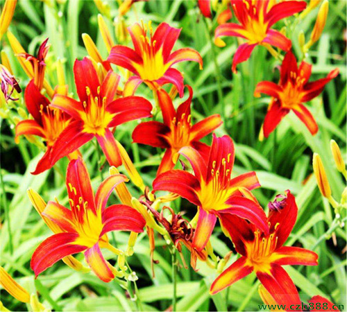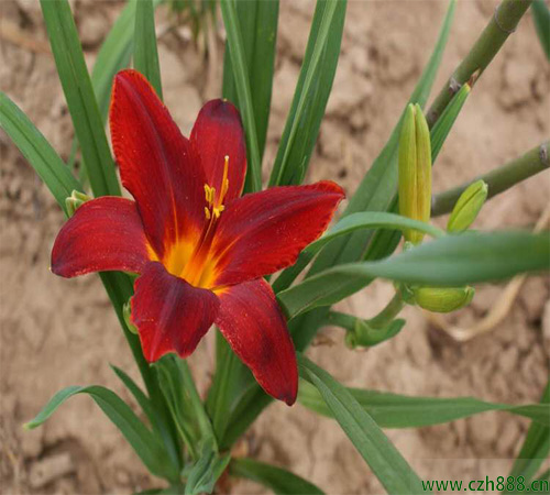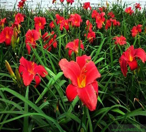 紅運萱草是百合科大花萱草屬宿根花卉,20世紀90年代末從美國引進的大花萱草品種。花上位 ,大紅色 ,花徑8~10cm,花蕾似簪,開如漏斗,裂片翻卷, 為百合狀花冠 ,花被基部合生呈筒狀; 花薹從中部抽出 ,高40~50cm ,花期 7 ~ 8 月。紅運'萱草生長勢強 ,分蘗能力中等 ,喜陽光,耐半蔭 ,抗旱、抗寒、抗病蟲能力強 ,適應性廣。在土層深厚、土壤肥沃及排水良好的砂質壤土中生長健壯 、開花繁茂。春季分株當年即可開花 ,且成活率高。
