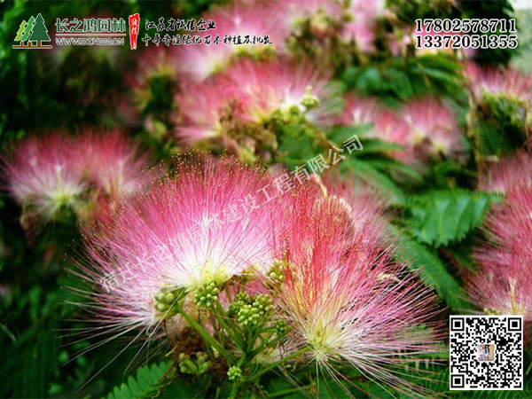 合歡(Albizia julibrissin Durazz.), 又名絨花樹,馬纓花。落葉喬木,夏季開花,頭狀花序,合瓣花冠,雄蕊多條,淡紅色。莢果條形,扁平,不裂。高4-15米。樹冠開展;小枝有棱角,嫩枝、花序和葉軸被絨毛或短柔毛。托葉線狀披針形;頭狀花序于枝頂排成圓錐花序;花粉紅色;花萼管狀,花期6-7月;果期8-10月。