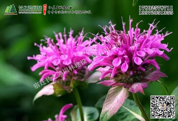 美國(guó)薄荷直立多年生草本。多年生草本。葉芳香。花期8~9月.輪傘花序密集,多花,花色為粉紅和深紅兩種,花筒上部稍膨大.裂片略成二唇形。苞片鮮艷明顯,招引蜜蜂。莖直立.喜肥沃.濕潤(rùn)的土壤。