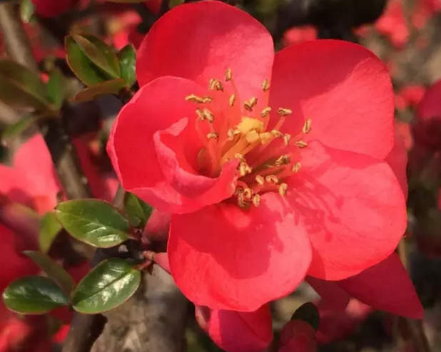 1、木瓜海棠花朵三五成簇,花色艷麗,適于庭院墻隅,草坪邊緣,樹叢周圍,池畔溪旁叢植,與老梅,勁松,山石配景,或用翠竹數株,則畫意倍增。