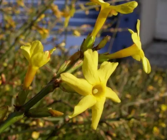 從南至北,迎春花從每年1月下旬到4月次第開放,花開時葉片尚未長出,鵝黃色的花朵生長在這些暗綠色的小枝上。花單生或者生在葉腋處,生長在小枝頂端的情況比較少見。花冠直徑兩厘米左右,底部合生,最下端為一兩厘米的管狀結構,而頂端則分裂成五到六片“花瓣”,偶爾還會有裂片更少或者更多的情況發生。