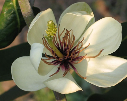 金葉含笑花梗直徑約5毫米,具3-4苞片脫落痕;花被片9-12片,淡黃綠色,基部帶紫色,外輪3片闊倒卵形,長6-7厘米,中、內(nèi)輪倒卵形,較狹小;雄蕊約50枚,長2.5-3厘米,花藥長1.5-2厘米,花絲深紫色,長0.7-1厘米;雌蕊群長2-3厘米,雌蕊群柄長1.7-2厘米,被銀灰色短絨毛;雌蕊長約5毫米,心皮長約3毫米,狹卵圓形,僅基部與花托合生;胚珠約8枚。聚合果長7-20厘米;蓇葖長圓狀橢圓體形,長1-2.5厘米。花期3-5月,果期9-10月。