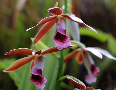 而鶴頂蘭,學名:Phaiustankervilleae (Banks ex L'Herit. ) Bl.,則是蘭科、鶴頂蘭屬多年生常綠地生草本植物。植株大型,高70~80厘米;假鱗莖圓錐狀,粗短肥厚、肉質,被鞘;葉2~6枚,互生,闊長圓狀披針形,長30~80厘米,寬6~12厘米,紙質,具縱向折扇狀脈。總狀花序由假鱗莖基部或葉腋抽出,粗壯直立,高達60~110cm,著花10朵~30余朵,花大,美麗,直徑7~10cm,花朵外面白色,內面暗赭色或棕紅色;唇瓣管狀,背面白色帶茄紫色的先端,內面茄紫色帶白色條紋。唇瓣與5個花被片巧妙組合,宛如仙鶴展翅飛翔,故名。花被片的背面為白色,唇瓣為紅色,因此又被稱為“花白心紅”,極富特色。花期3-6月。