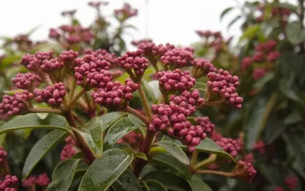 地中海莢蒾是忍冬科常綠灌木,多分枝,聚傘花序,花蕾粉紅色,于秋季顯蕾,直至第2年春季才開花,花白色,冬、春季都有其特殊的觀賞特色。枝葉繁茂,耐修剪,其整形可參照夾竹桃,養護修剪以疏剪為主,宜在春末花后進行。